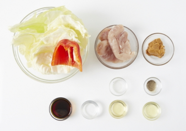 양배추 10~15장, 파프리카 1/2개, 닭가슴살 3쪽, 밑간양념(간장 2½T, 맛술 1½T, 후춧가루 약간), 땅콩소스(식초 2t, 땅콩잼 3T, 올리고당 1½T, 올리브유 1T)