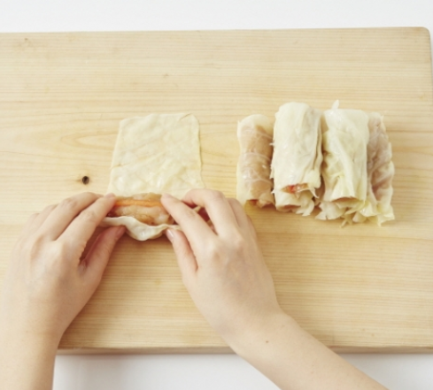 4. 양배추에 밑간 한 닭가슴살과 파프리카를 올려 돌돌 말아줍니다.