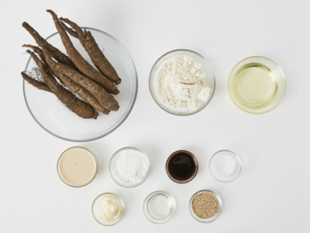 더덕 6뿌리, 찹쌀가루 3큰술, 튀김가루 5큰술, 식용유(2컵+3큰술), 볶음참깨 3큰술, 소금 약간, 간장 1.5큰술, 두유 4큰술, 마요네즈 2큰술, 꿀 1큰술