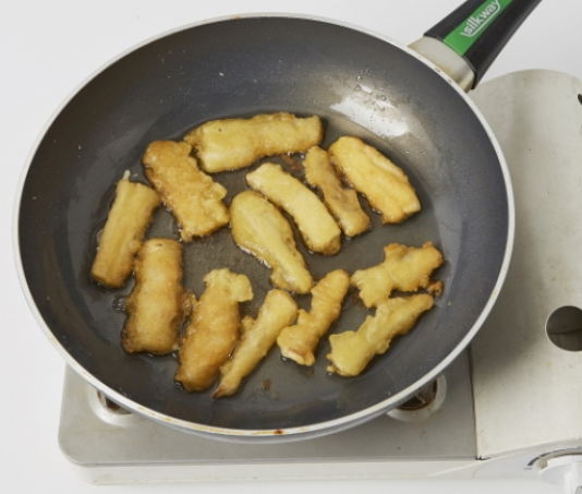 4. 더덕은 찹쌀튀김반죽에 묻힌 뒤 180도로 예열한 식용유 2컵에 튀겨 건집니다.