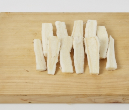 1. 더덕은 씻어 흙을 제거한 뒤 길게 칼집을 넣고 결대로 껍질을 돌려 길게 반 자릅니다.