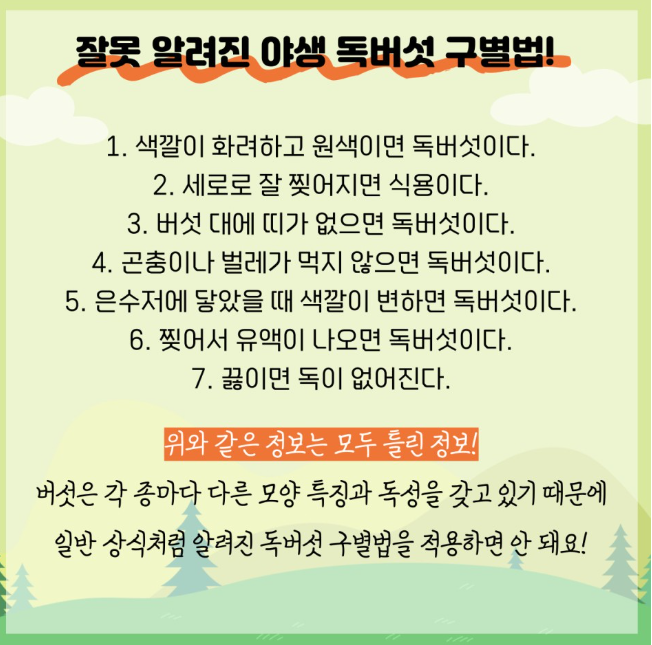 색이 화려하면 독버섯이라거나, 은수저에 닿았을 때 색이 변하면 독버섯, 또는 끓이면 독이 없어진다 등 일반 상식처럼 알려진 독버섯 구별법은 대부분 잘못된 정보이므로, 절대 믿어서는 안 된다고 합니다.