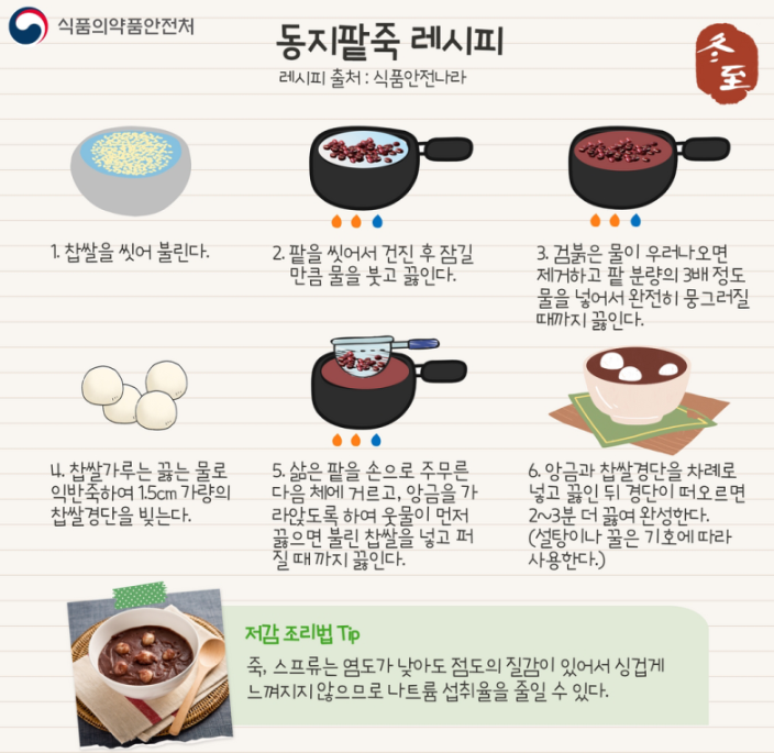 팥이 들어간 다양한 음식 중에서도 엯, 동지 하면 동지팥죽을 빼놓을 수 없습니다. 동지팥죽 레시피를 보고 함께 따라 만들어 보는 것도 좋을 것 같습니다. 참고로 팥죽처럼 점도가 높은 죽이나 수프류는 소금의 양이 조금 덜 들어가더라도 덜 싱겁게 느껴지기 때문에 나트륨 섭취를 줄일 수 있는 음식이라고 합니다.