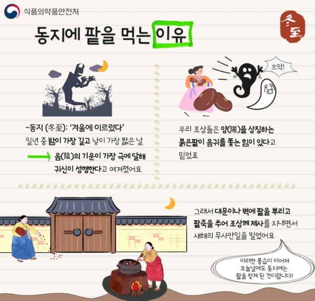동지는 '겨울에 이르렀다'는 뜻으로, 일 년 중 밤이 가장 길고 낮이 가장 짧은 날입니다. 우리 조상들은 밤이 가장 긴 날에는 음의 기운이 가장 극에 달해 귀신이 성행한다고 여겼다고 합니다. 양을 상징하는 붉은팥은 그러한 음귀를 쫓는 힘이 있다고 믿었다고 합니다. 따라서 예로부터 동짓날에는 팥죽을 수어 조상께 제사를 지내고 대문이나 벽에 뿌려 귀신을 쫓아 새해의 무사안일을 빌던 풍습이 전해져 내려왔다고 합니다. 이런 동지의 전통이 오늘날까지 이어져 동지에 팥을 찾아 먹게 된 것이라고 합니다.