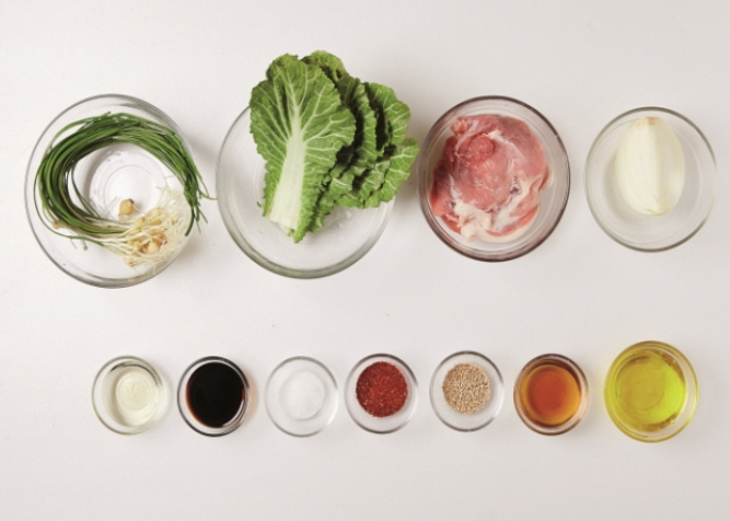 2. 봄동은 한입 크기로 어슷 썰고, 양파는 채 썰고, 달래와 돼지고기도 한 입 크기로 썹니다.