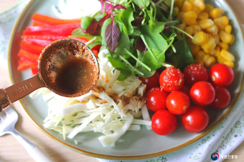 4. 먹기 직전, 적당량 끼얹어주면 '들깨냉채'가 완성입니다.