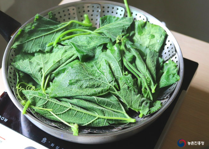 7. 김이 오르면 찜기에 호박잎 10장을 넣고 5분간 쪄 한 김 식혀줍니다.