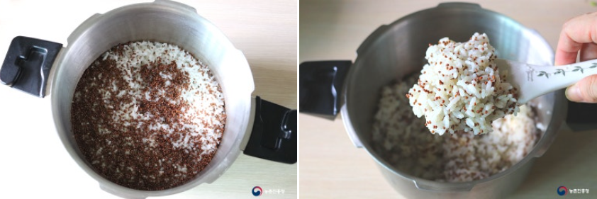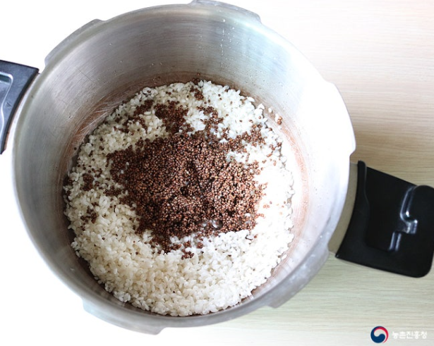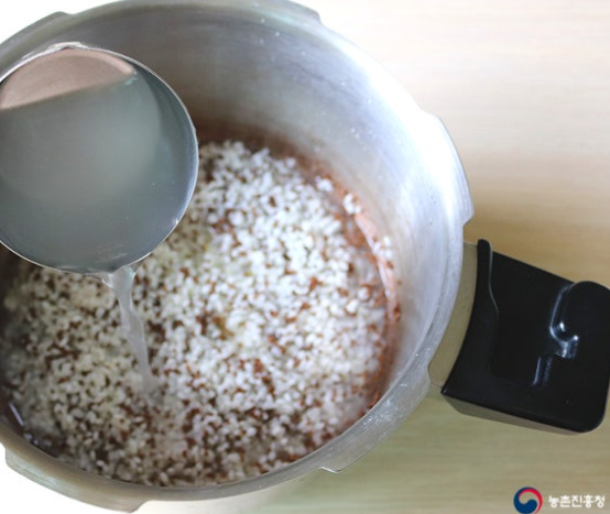 4. 쌀을 불렸던 쌀뜨물로 밥을 합니다. 쌀과 통들깨 전체 양(2컵) 보다 조금 적게 쌀뜨물 1¾컵을 부어줍니다.
