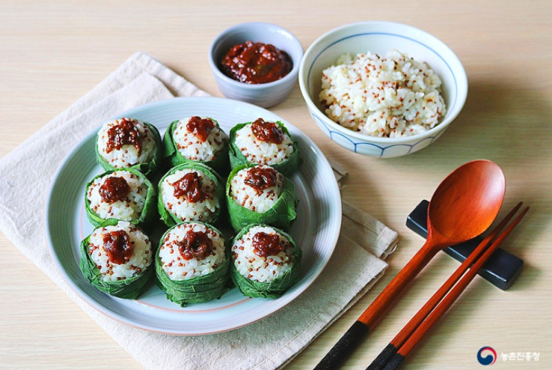 들깨밥에 부드러운 호박잎을 감싸 완성한 '들깨쌈밥'이 완성되었습니다. 밥을 반만 감싸 밥 속 콕콕 박힌 들깨가 보여서인지 시각적으로 더욱 먹음직스러워 보입니다. 감싸는 게 번거로우신 분은 잘게 썰어 밥이나 쌈장에 섞어 즐기셔도 좋습니다.