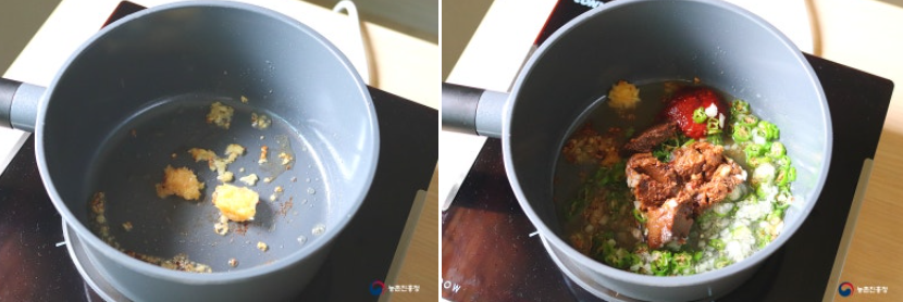8. 프라이팬에 식용유 1큰술을 두르고 다진 마늘 1큰술을 넣고 볶다가 고추장 1큰술, 된장 2큰술, 올리고당 1큰술, 물 50ml를 부어 섞어줍니다.