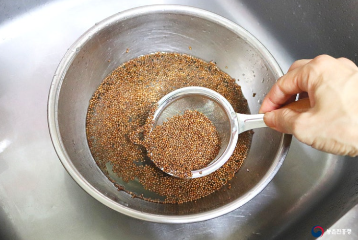 2. 들깨 1/2컵은 물에 담가 물 위에 뜨는 들깨만 체로 건져줍니다.