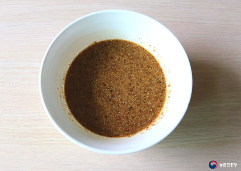 3. 들깨 냉채소스 재료(가장 2큰술, 물 2큰술, 식초 1큰술, 올리고당 1큰술, 들깨가루 2큰술)를 한 곳에 고루 섞어줍니다.