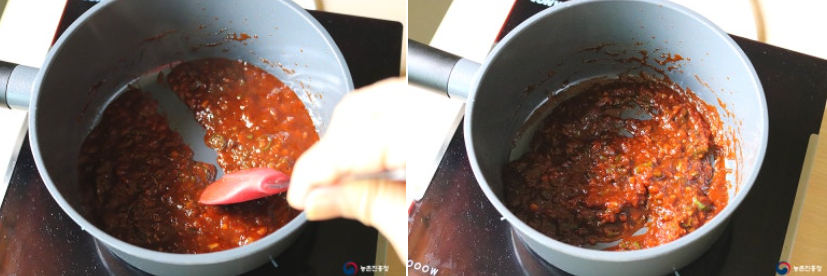 9. 묽었던 재료들이 적당히 졸아들고 프라이팬의 바닥이 보일 때까지 볶아줍니다.