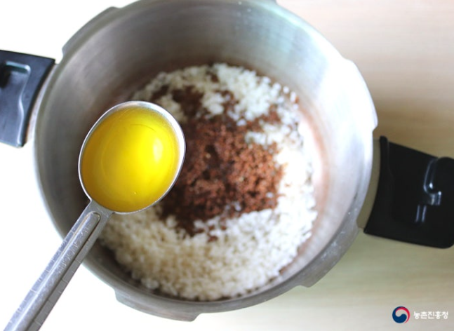 3. 압력솥에 불린 통들깨, 들기름 1큰술을 넣고 섞어줍니다.