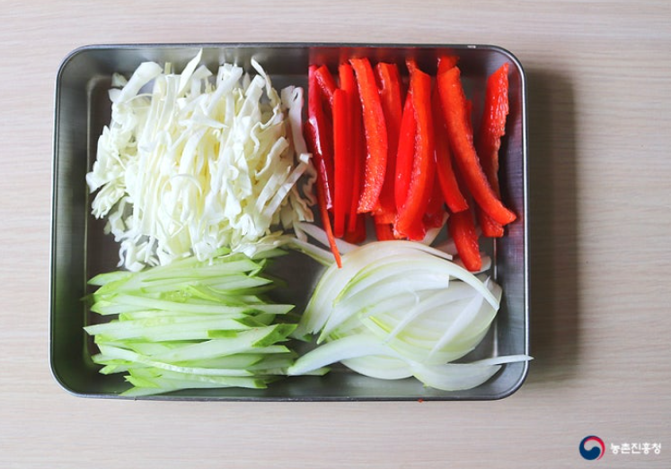 1. 채소는 가급적 생으로 먹을 수 있는 것으로 준비하고, 양배추 1장, 오이 1/2개, 양파 1/4개, 파프리카 1/4개는 가늘게 채 썰어줍니다.