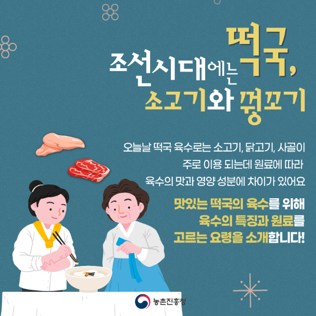 다양한 육수 원료로 만들어진 떡국! 각각의 특성에 따라 풍부한 맛과 향을 지니고 있어 더욱 매력적입니다.