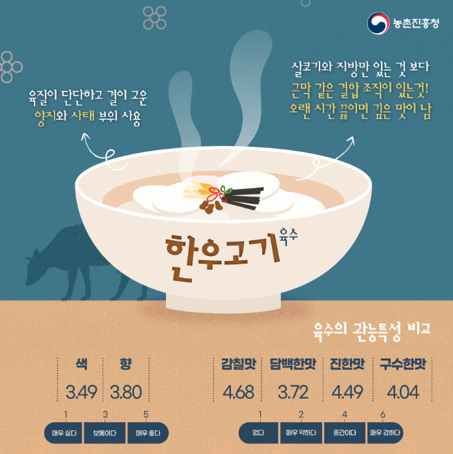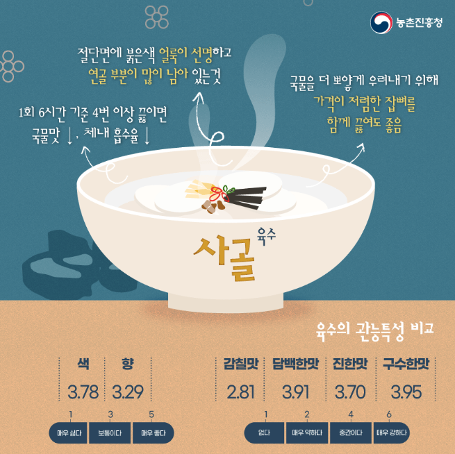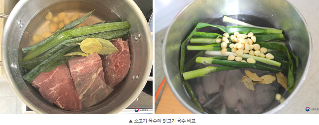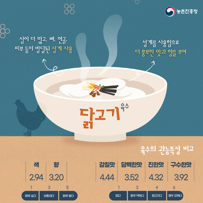 농촌진흥청에서 원료별 육수 맛 성분을 비교했을 때 한우고기와 닭고기 육수에서 감칠맛을 내는 이노신일인산염(IMP) 함량이 멸치, 사골 육수보다 높게 나타났다고 합니다.