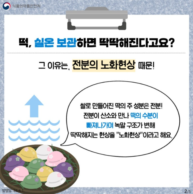 '전분의 노화 현상'은 산소와 만난 떡의 수분이 빠져나가게 되며 딱딱해지는 것을 말한다고 합니다.