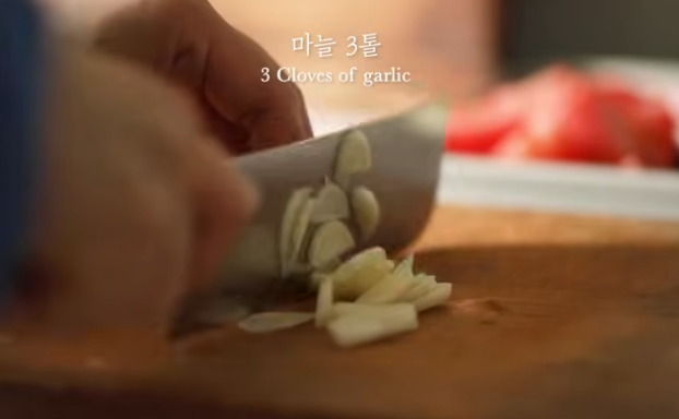 2. 마늘은 편 썰고 양파는 채를 썰어줍니다. 자투리 채소와 소스용 토마토 1개를 깍둑 썰어줍니다.