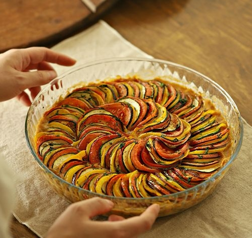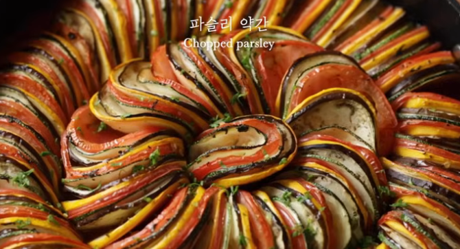 만드는 과정도 복잡하지 않습니다. 우선 가지, 호박, 토마토 등 알록달록 색감의 채소를 동글동글하게 자릅니다. 토마토소스와 올리브 오일, 소금, 후춧가루 등으로 간을 맞춥니다. 재료를 오븐에 구워서 만들면 완성이라고 합니다.