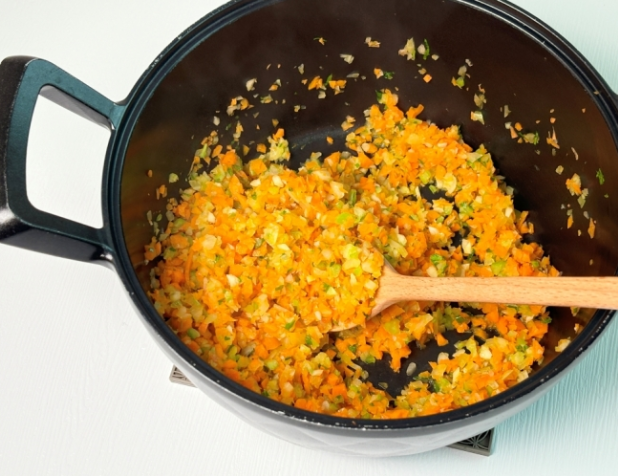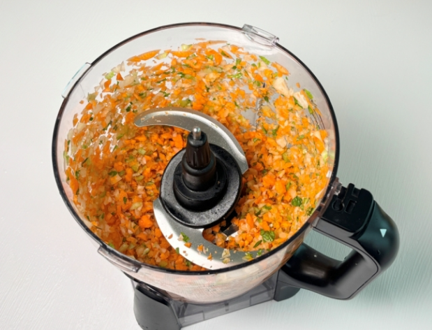 1. 당근, 샐러리, 양파, 마늘을 자르고 믹서기에서 다져줍니다.(푸드 프로세서가 없다면, 가능한 한 잘게 썰어줍니다.)