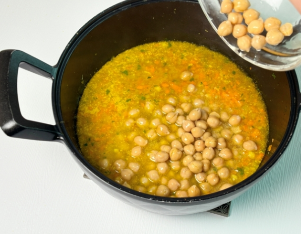3. 병아리콩과 야채 육수를 넣고 끓입니다. 오르조를 넣고 불을 약불로 낮추고 알덴테로 익힙니다.
