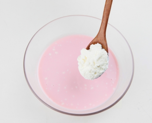 석류 반개(석류즙), 리코타치즈 200g, 생크림 100g, 생크림 100g, 우유 100g, 물엿 50g, 설탕 25g, 판 젤라틴 1장