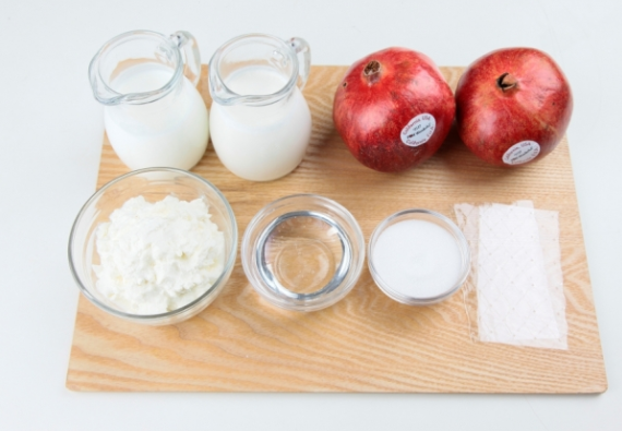 석류 반개(석류즙), 리코타치즈 200g, 생크림 100g, 생크림 100g, 우유 100g, 물엿 50g, 설탕 25g, 판 젤라틴 1장