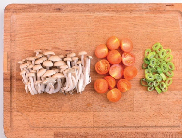 1. 느티만가닥버섯은 밑동을 자리고, 방울토마토는 2등분하고, 대파는 송송 썰어줍니다.