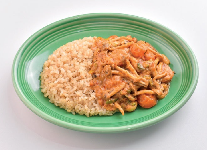 4. 소스가 졸아들면 불을 끄고 현미밥과 함께 그릇에 담아 완성합니다.