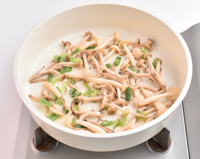 2. 중불로 달군 팬에 식용유 2T를 두른 뒤 송송 썬 대파를 넣어 볶다가 느티만가닥버섯을 넣고 볶아줍니다.