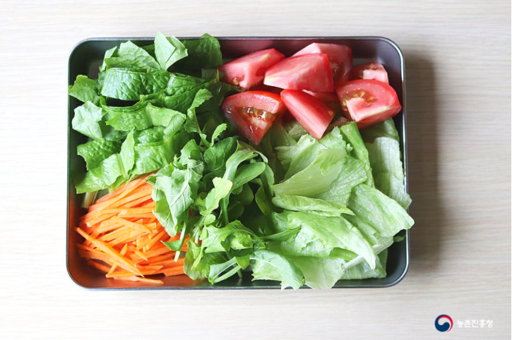 3. 로메인상추 5장과 양상추 2장, 루꼴라 1/2줌은 한 입 크기로 썰거나 손으로 뜯어 준비하고 당근 1/5개는 가늘게 채 썰어줍니다. 토마토 1/2개도 한 입 크기로 썰어줍니다.