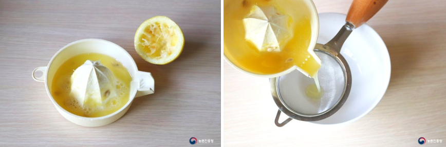 1. 레몬 1개는 1/2등분 해 스퀴즈에 짜둔 뒤 체에 밭쳐 즙만 걸러줍니다.