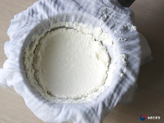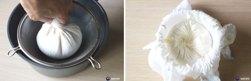 8. 조금 더 단단한 질감의 리코타치즈를 원하는 분은 면포를 감싸고, 그 위로 무거운 물건을 올려 수분을 최대한 제거해 탄력 있게 만들어줍니다.