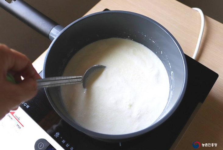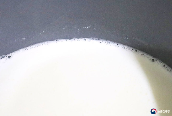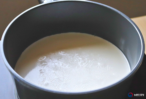 3. 표면에 얇은 막이 생기고 가장자리에 잔거품이 생길 때까지 휘젓지 말고 그대로 약불에서 끓여줍니다.