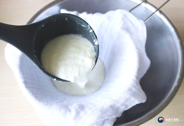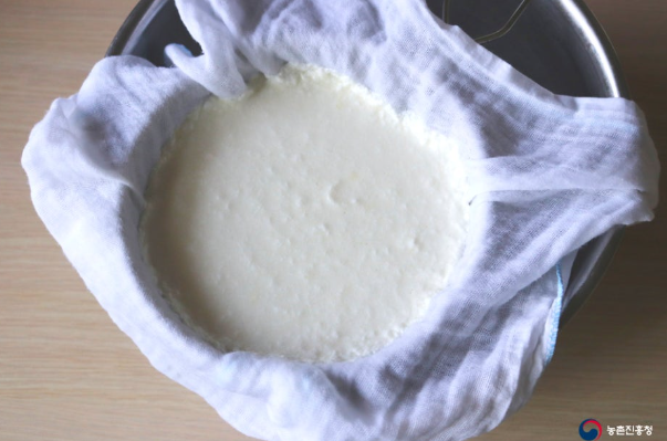 6. 유청이 분리되면 체 위에 면포를 받쳐 물기를 빼줍니다.