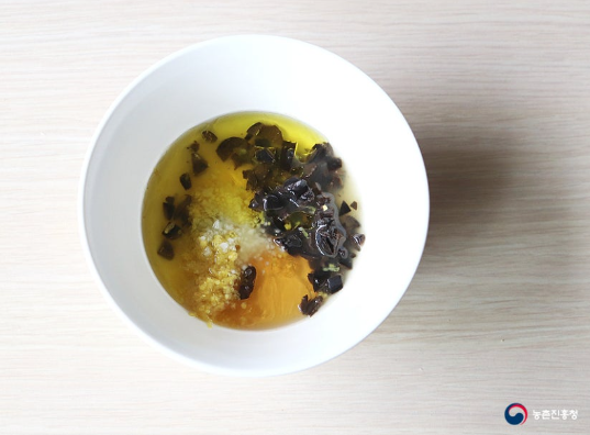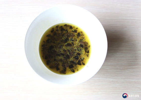 5. 볼에 올리브레몬드레싱 재료(레몬즙 3큰술, 레몬제스트 1큰술, 올리브오일 1큰술, 꿀 1큰술, 다진 블랙올리브 1큰술, 소금 1/2작은술을 한데 담아 섞어줍니다.