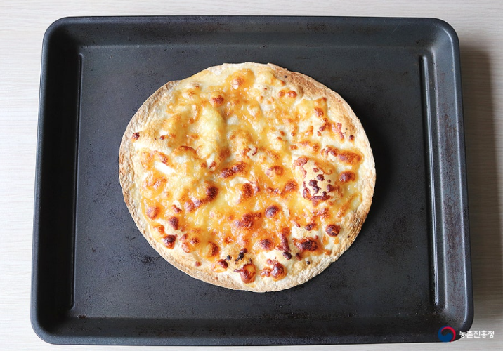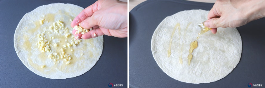 1. 또띠아 1장 위로 스틱형 꿀 1개를 발라준 후 피자치즈 2큰술을 홑뿌려줍니다.