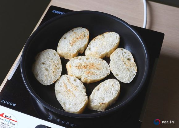 2. 기름 두르지 않은 마른 팬에 바게트를 올리고 앞뒤로 노릇하게 구워줍니다.