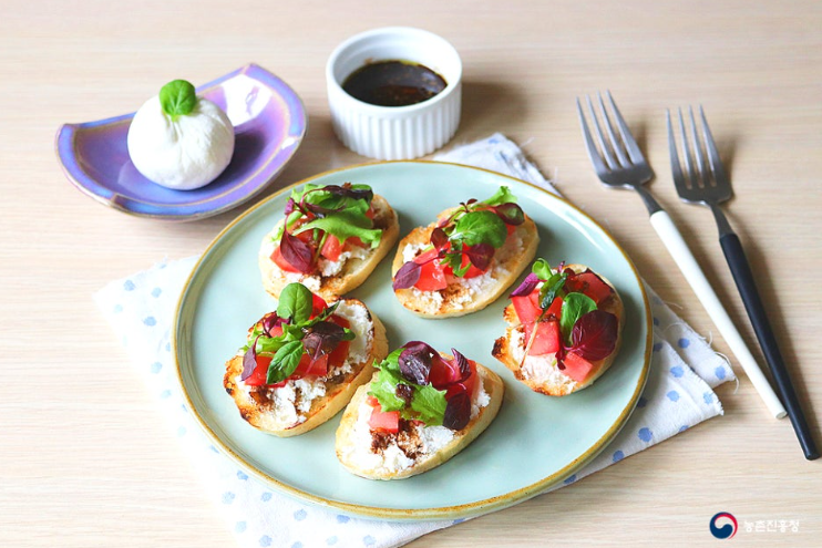 하나씩 들고 먹기 좋은 '리코타치즈카나페'가 완성됐습니다. 뽀얀 리코타치즈 위로 알록달록 채소가 올라가 눈과 입을 즐겁게 해 줍니다.