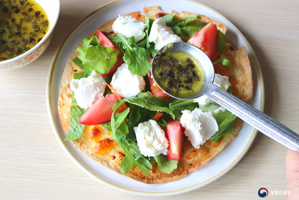 먹기 직전 올리브레몬드레싱을 적당량 뿌려 드시면 됩니다. 바삭한 피자도우와 상큼한 샐러드가 어우러진 '리코타치즈샐러드피자' 완성입니다.
