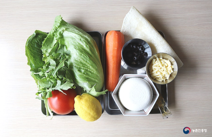 또띠아 1장, 리코타치즈 1/2컵, 로메인상추 5장, 양상추 2장, 토마토 1/2개, 피자치즈 2큰술, 레몬 1개, 스틱형 꿀 1개, 당근 1/5개, 루꼴라 1/2줌, 올리브레몬드레싱(레몬즙 3큰술, 레몬제스트 1큰술, 올리브오일 1큰술, 꿀 1큰술, 다진 블랙올리브 1큰술, 소금 1/2작은술)