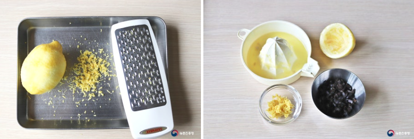 4. 깨끗이 씻은 레몬 1개는 강판을 이용해 겉껍질을 얇게 벗겨 레몬 제스트를 만들어줍니다. 레몬 제스트로 사용한 레몬은 1/2등분 한 후 스퀴즈를 이용해 즙을 만들고, 블랙올리브 1큰술은 잘게 다져줍니다.