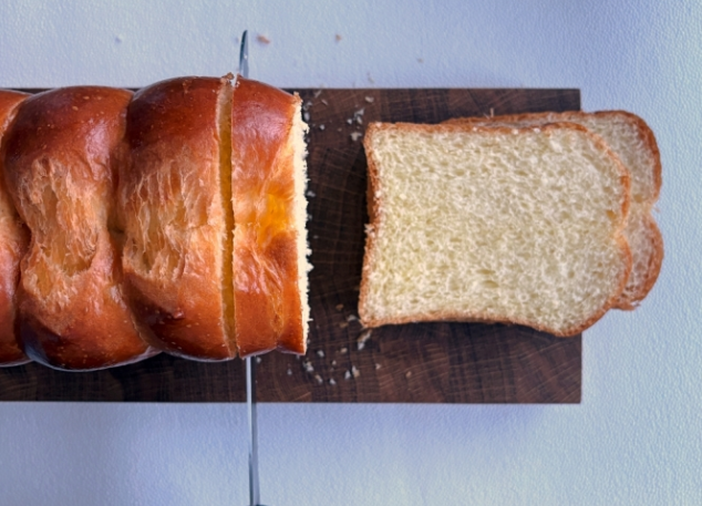 3. 브리오슈를 1인치 두께로 썰어 다른 베이킹 시트에 올려 약 3분간 오븐에서 황금빛 갈색이 될 때까지 토스트합니다.