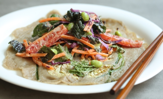 메밀가루 1/2컵, 물 2테이블스푼, 배추 2~3잎, 파 약간, 식물성 기름, 토핑(완두콩, 예로 파프리카, 레드 파프리카, 적채 슬라이스, 당근 슬라이스), 소스(간장 1테이블스푼, 참기름 1티스푼, 참깨 약간)
