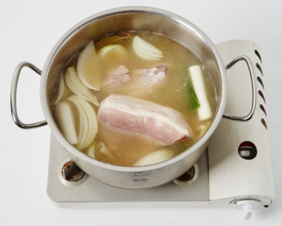1. 냄비에 물 8컵, 고기 삶는 재료를 넣어 센 불에 올린 뒤 끓기 시작하면 돼지고기를 넣고 삶아줍니다.