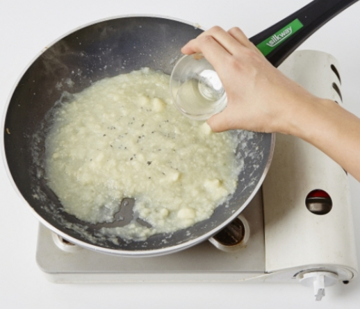 5. 마늘 1/2컵은 믹서에 갈아 팬에 붓고 저어가며 중약 불에서 4분간 끓인 뒤 꿀과 식초를 넣고 3분 정도 더 끓여줍니다.