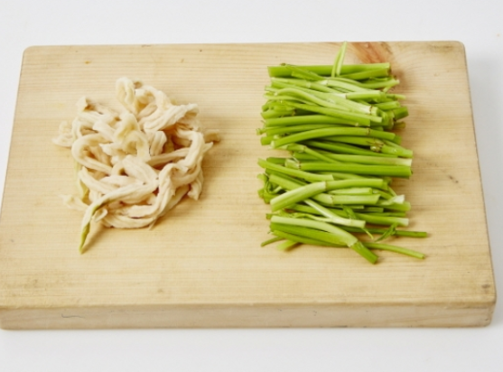 3. 무말랭이는 찬물에 담가 부드럽게 불린 뒤 주물러가며 물을 바꿔 씻어 물기를 짜고, 미나리는 6cm 길이로 썰어줍니다.