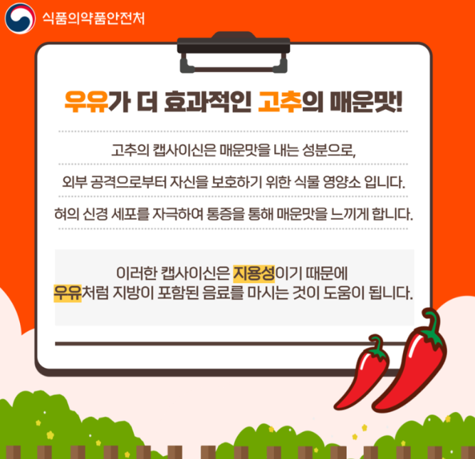 이러한 캡사이신은 지용성이기 때문에 우유처럼 약간의 지방이 포함된 음료를 마시는 것이 도움이 된다고 합니다.
