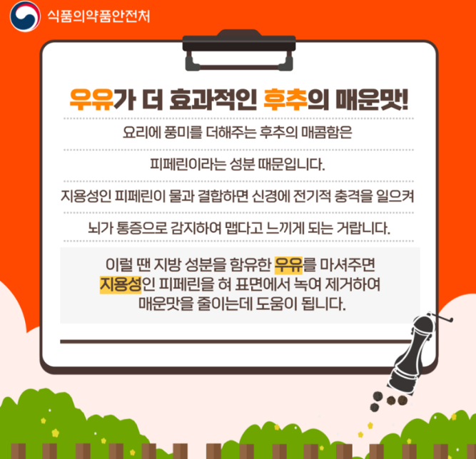 이럴 땐 지방 성분을 함유한 우유를 마셔주면 지용성인 피페린을 혀 표면에서 녹여 제거하여 매운맛을 줄이는데 도움이 된다고 합니다.
